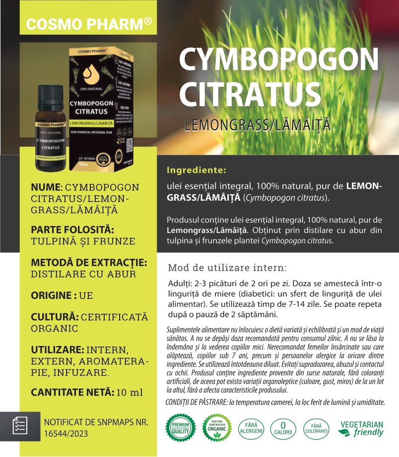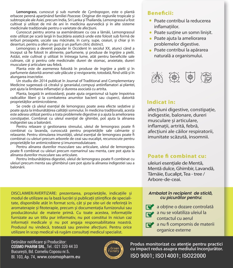 Ulei Esential Integral 100% NATURAL PUR de LEMONGRASS/LĂMÂIȚĂ pentru uz intern. Obtinut prin distilare cu aburi din tulpina si frunzele plantei Cymbopogon citratus.