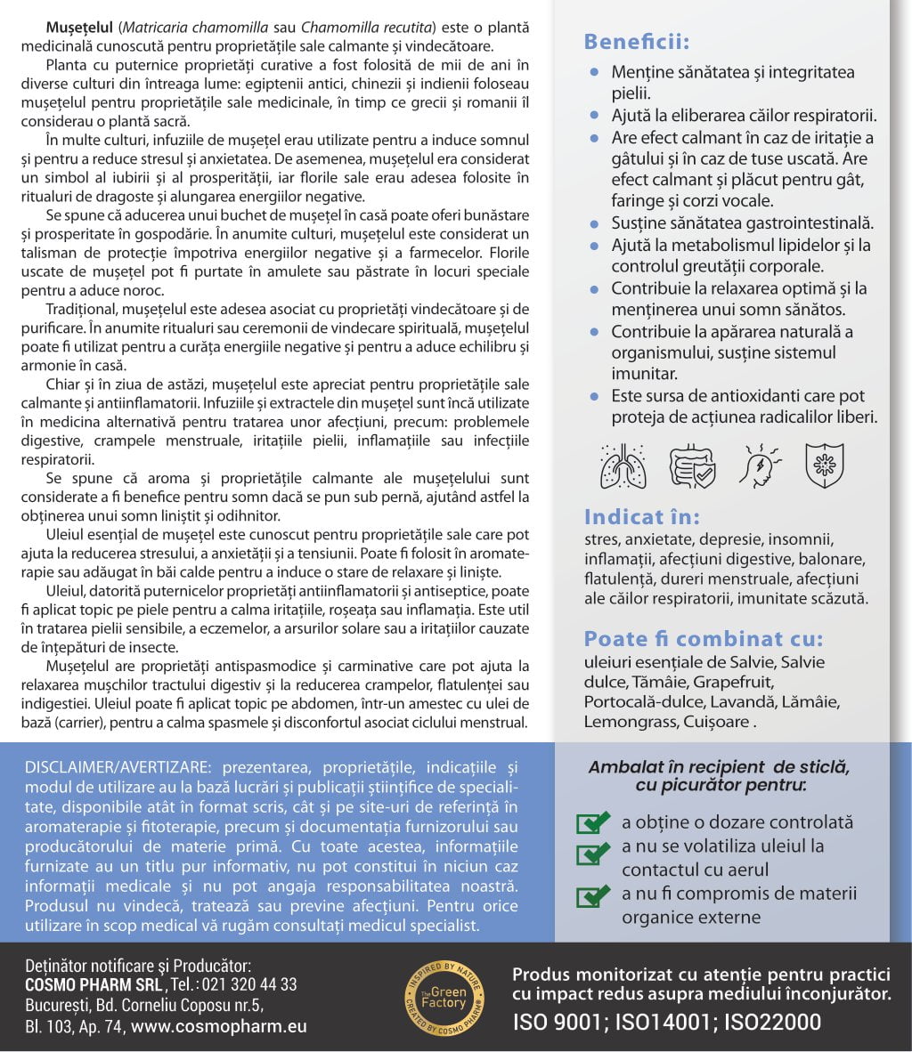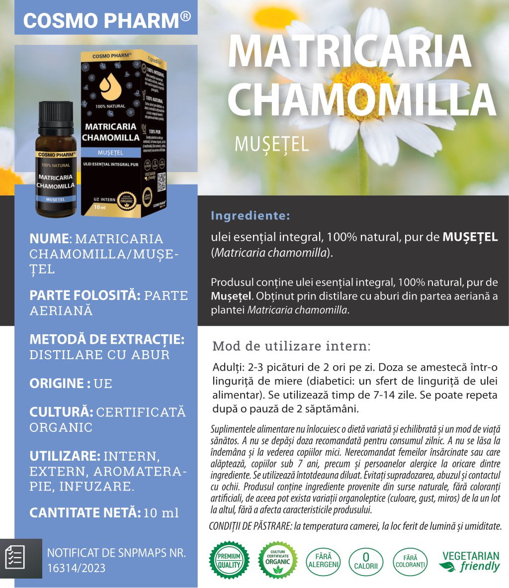 Ulei Esential Integral 100% NATURAL PUR de Musetel (Matricaria Chamomilla) pentru uz intern. Obtinut prin distilare cu abur din partea aeriana plantei Matricaria Chamomilla.