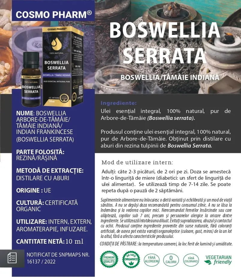 BOSWELLIA SERRATA – 10 ml de ulei esențial complet pur extras din Arbore-de-Tamaie, adecvat pentru utilizare internă.