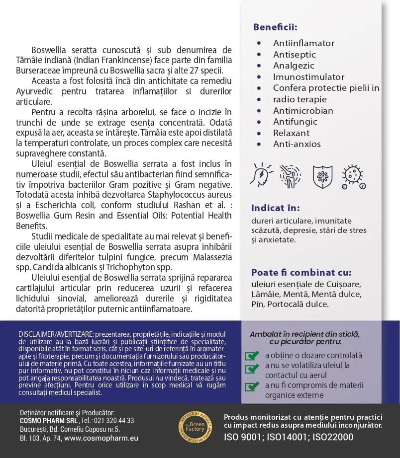 Prezentarea, proprietatile, indicatiile si modul de utilizare au la baza lucrari si publicatii stiintifice de specialitate, disponibile atat în format scris, cat si pe site-uri de referinta în aromaterapie și fitoterapie, precum și documentatia furnizorului sau producatorului de materie primă. Cu toate acestea, informațiile furnizate au un titlu pur informativ, nu pot constitui în niciun caz informații medicale și nu pot angaja responsabilitatea noastră. Produsul nu vindeca, trateaza sau previne afectiuni. Pentru orice utilizare in scop medical vă rugam consultati medicul specialist. Produs monitorizat cu atenție pentru practici cu impact redus asupra mediului înconjurător.